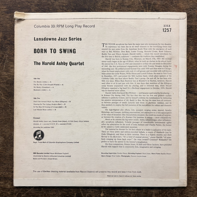 Harold Ashby Born To Swing Mono 33SX 1257 Vinyl Record Album Columbia Landsdowne